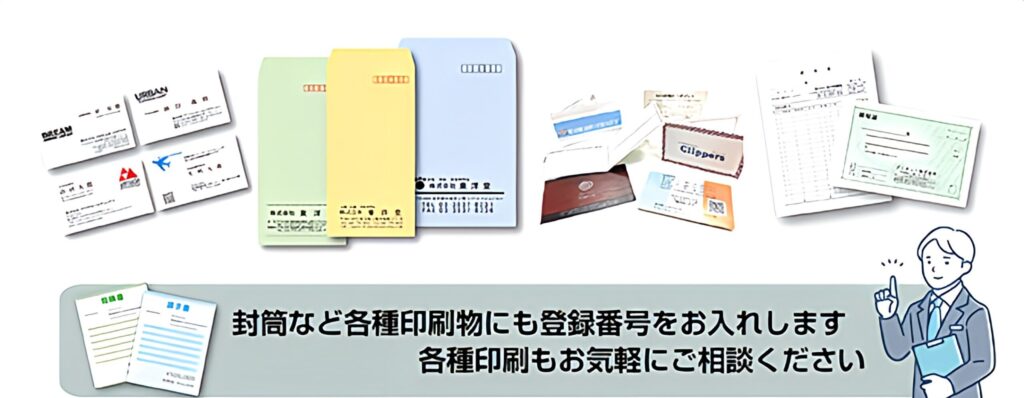 上記商品以外にも、「封筒」や「会社案内」「お名刺」などにも登録番号を記載し